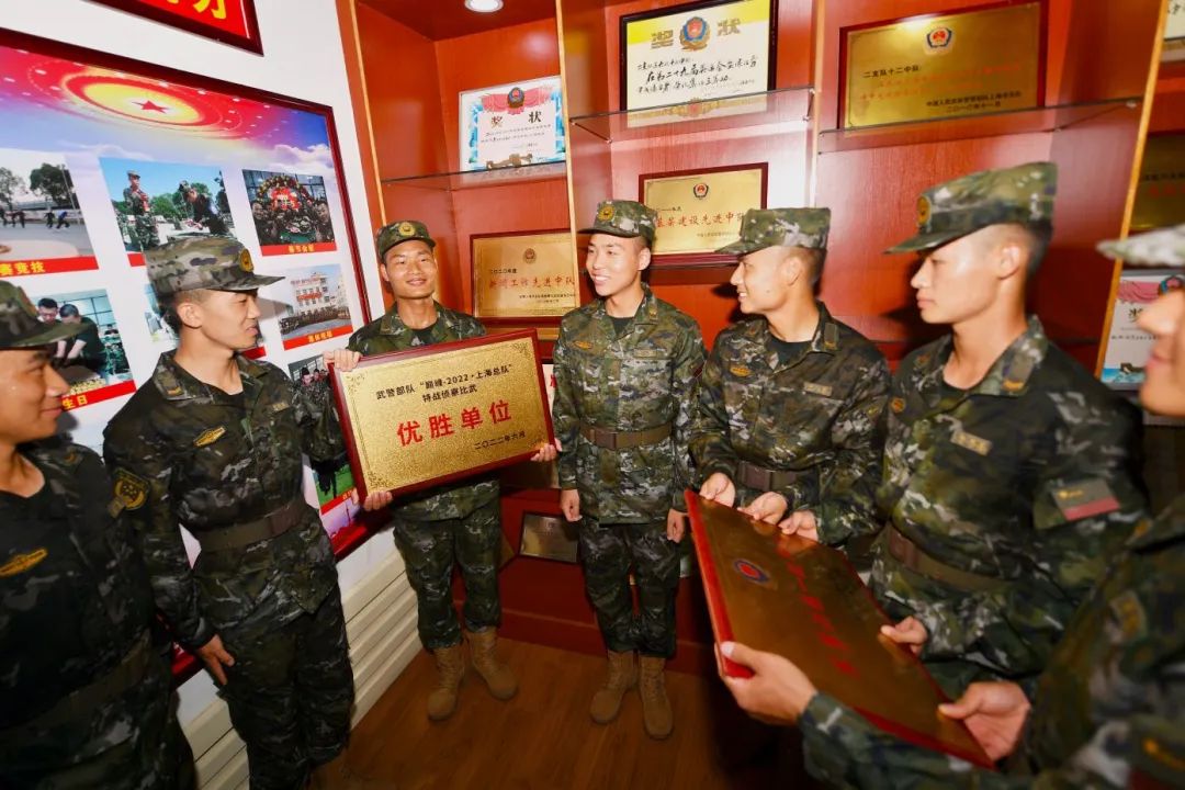 在中队荣誉室,班长阳刚向大家讲述着中队的辉煌历程和光荣传统。荣誉室内,一件件珍贵的历史物件见证中队的成长壮大,一张张照片记录着官兵的最美瞬间,一面面锦旗、一块块奖牌承载着中队“无所畏惧、无往不前、无坚不摧”的连队精神,一件件物品背后的故事都激发着官兵的战斗豪情,让大家深感责任重大。