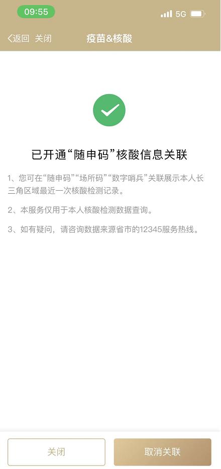 开通成功后,次日即可在“随申码”“场所码”“数字哨兵”关联展示本人长三角区域最近一次核酸检测记录。数据如有异议,可咨询数据来源省份的12345服务热线。