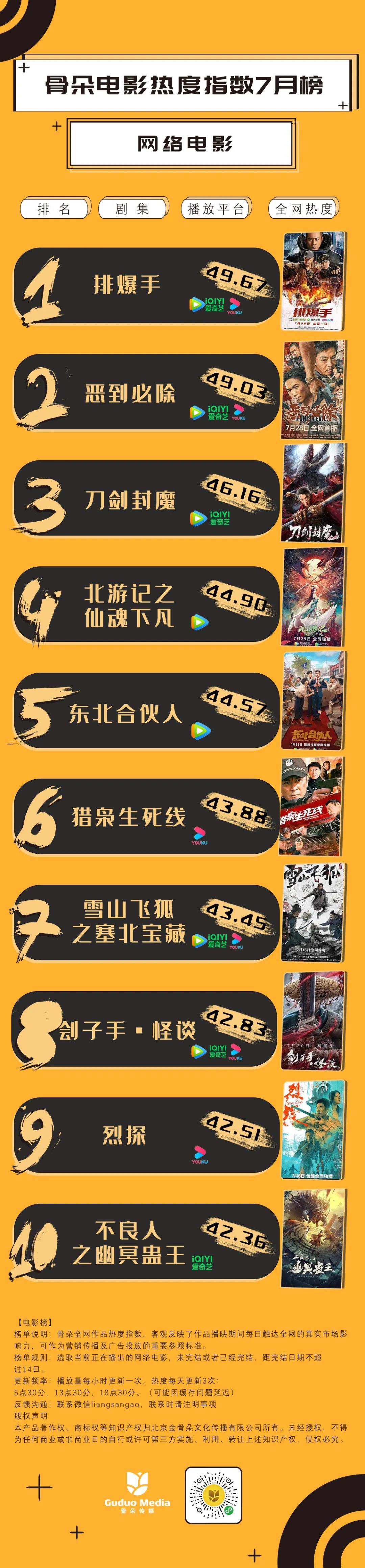 原标题:《7月网影月榜丨《排爆手》《恶到必除》等新主流网影多平台开播,整体网影市场热度有所上升》