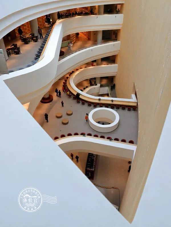 威海市图书馆占地面积4.2万平方米,位居全省第二,整整有七层楼,整体造型融入“大海”的元素,两侧黄色大理石像人的双臂拥抱大海,象征着图书馆是知识的海洋。