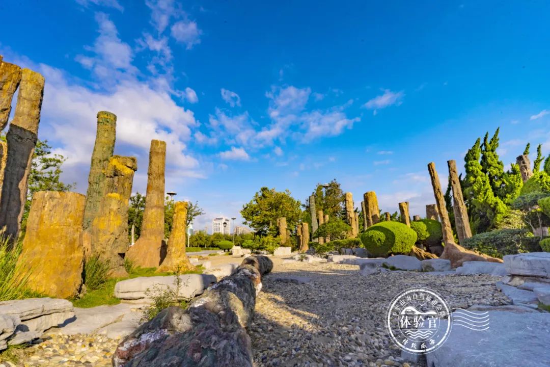 整个公园绿树成荫,花团锦簇,大海、树林、绿地、鲜花、雕塑、山石、建筑有机结合,相互辉映,构成一幅优美的生态海滨城市画卷。