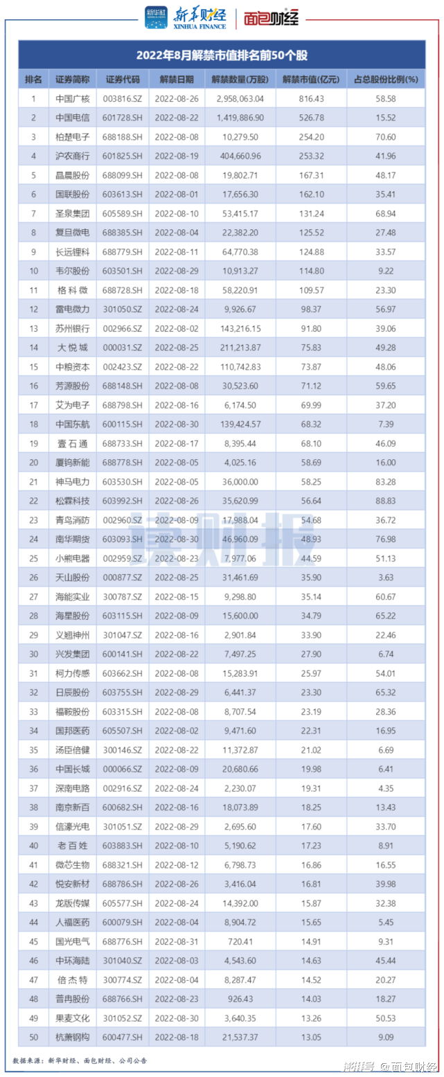 中国广核解禁市值占据首位。8月26日,公司将迎来巨量解禁潮,涉及股东分别为中国广核集团有限公司和国新央企运营(广州)投资基金(有限合伙)。本轮限售股解禁市值约为816亿元,占总股本比例达58.58%。