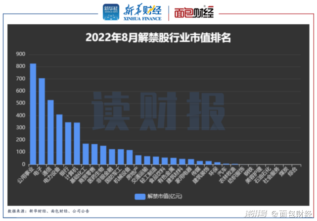 2022年8月,A股将有168家公司的限售股面临解禁,合计解禁量约为627.51亿股,解禁规模超4000亿元,在全年中处于中上规模。从行业分布来看,公用事业、电子、通信解禁市值位列前三。其中,中国广核解禁规模居首,解禁市值超800亿元。