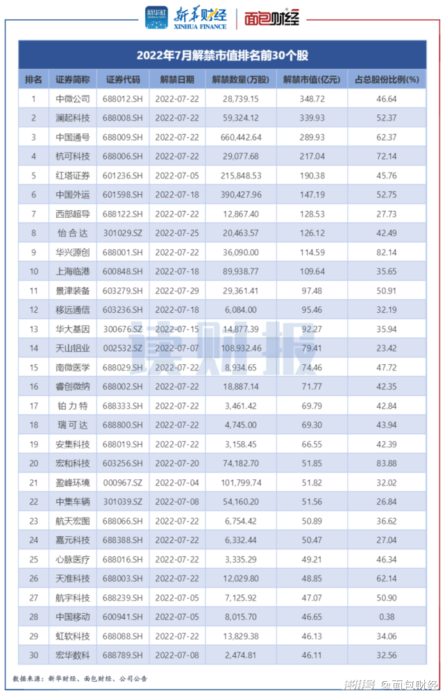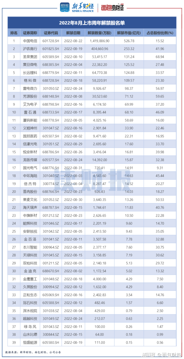 此外,共有39家公司、216.42亿限售股于8月迎上市周年解禁,解禁市值逾1900亿元,包括中国电信、复旦微电等企业。