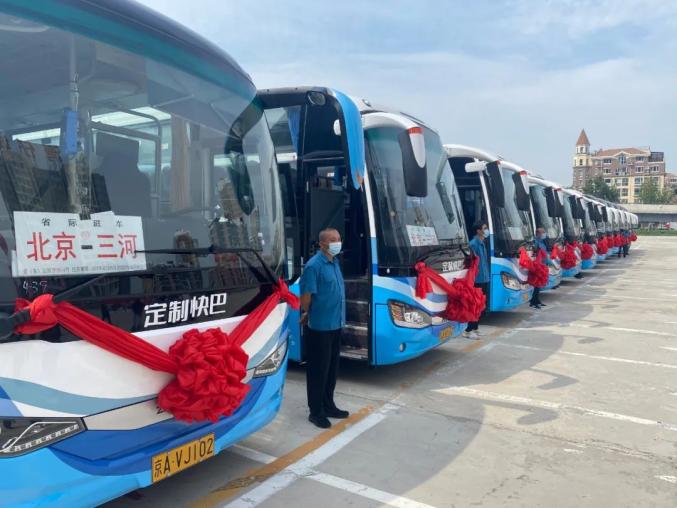 7月22日,三河(燕郊)至北京通勤定制快巴试点运营开通,10余辆大巴车整装待发。