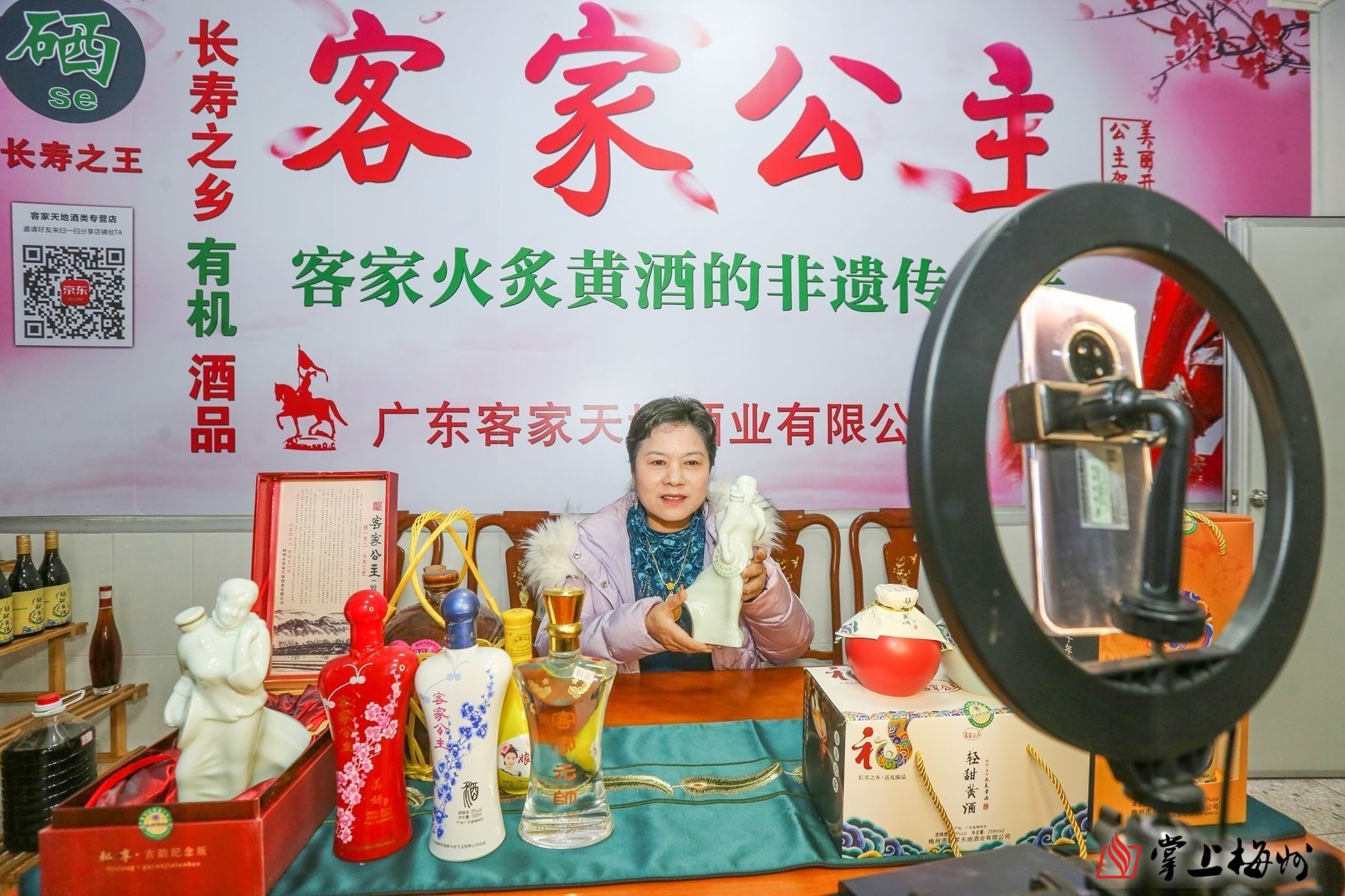 △梅州市客家天地酒业有限公司董事长黄淑辉正在通过直播推介公司产品。