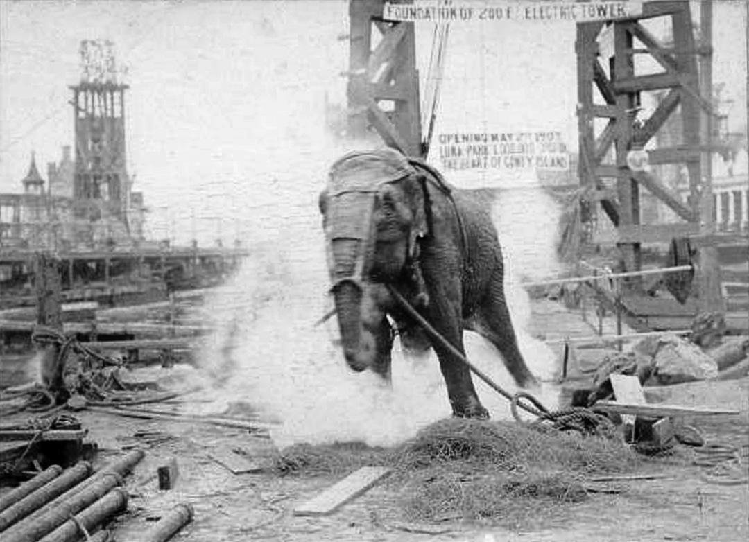 大象托普西电刑现场的新闻照片,摄于1903年1月4日。在托普西身后可见一座正在修建之中的“电塔”,不知是哪个建筑蠢材为露娜公园(Luna Park)建造。© wikimedia