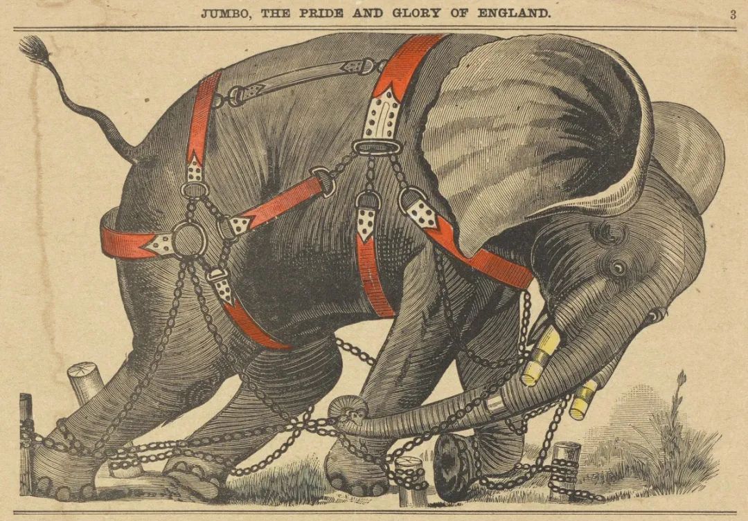 这是某不知名报纸上的插画,画中的金宝——“英格兰的光荣与骄傲”——于1882年被卖给费·泰·巴纳姆(P. T. Barnum)经营的马戏团。© collections.ctdigitalarchive.org
