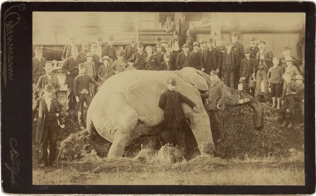 1885年9月15日,大象金宝在安大略圣托马斯与一辆火车相撞。照片中人们与死去的金宝合影。© collections.ctdigitalarchive.org