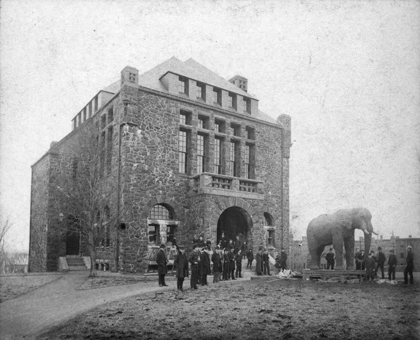 “巨象”由詹姆斯·V·拉弗蒂设计并于1885年开建,是拉弗蒂设计的“大象露西”的放大版本。“大象露西”于1881年开建,位于亚特兰大城附近,至今仍然存在;建筑“巨象”的结局则是被大火吞噬,这似乎以某种令人匪夷所思的方式预言了近80年后塔夫茨大学里金宝那具象皮标本的命运。