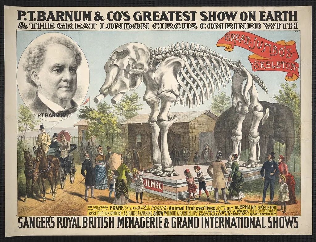 一张彩色马戏团海报,吸引人们前来观看“金宝的巨大骨架”。创作时间约在1885至1890年间。海报中有如下黄色文字:“这具庞大而雄伟的骨架来自世界上最为巨大、最为尊贵的动物。本次为全球首次公开大象骨架展。”© wikimedia
