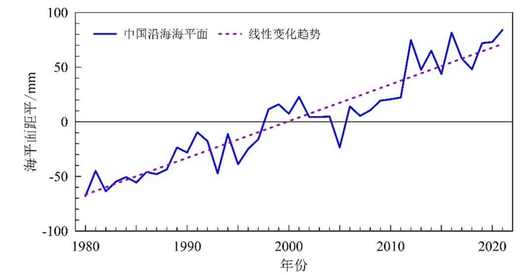 中国沿海海平面变化总体呈波动上升趋势。1980~2021年,中国沿海海平面上升速率为3.4毫米/年,高于同期全球平均水平。2021年,中国沿海海平面较1993~2011年平均值高84毫米,为1980年以来最高。
