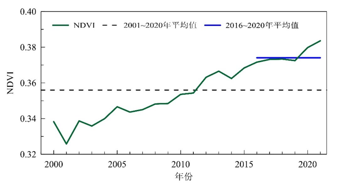 中国整体的植被覆盖稳定增加,呈现变绿趋势。2000~2021年,中国年平均归一化植被指数(NDVI)呈显著上升趋势。2021年,中国平均NDVI较2001~2020年平均值上升7.9%,较2016~2020年平均值上升2.5%,为2000年以来的最高值。