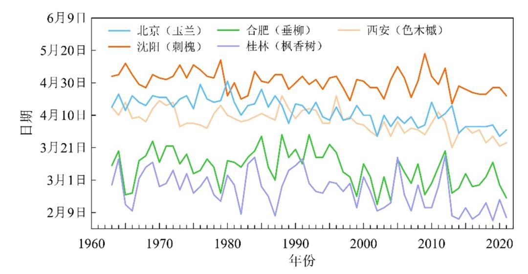 中国不同地区代表性植物春季物候期均呈提前趋势,秋季物候期年际波动较大。1963~2021年,北京站的玉兰、沈阳站的刺槐、合肥站的垂柳、桂林站的枫香树和西安站的色木槭展叶期始期平均每10年分别提早3.5天、1.5天、2.5天、3.0天和2.8天。