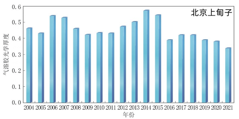 中国气溶胶光学厚度总体呈下降趋势,阶段性变化特征明显。2004~2014年,北京上甸子、浙江临安和黑龙江龙凤山区域大气本底站气溶胶光学厚度(AOD)年平均值波动增加;2014~2021年,均呈波动降低趋势。2021年,北京上甸子和浙江临安区域大气本底站可见光波段(中心波长440 nm)AOD平均值分别为0.34±0.33和0.41±0.23,较2020年均有小幅降低;黑龙江龙凤山区域大气本底站AOD平均值为0.30±0.24,较2020年略有升高。