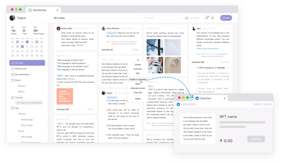 相比Web2社交媒体,Metanotey的主要特点是通过以太坊/Polygon链的区块链协议将原创内容、所有权通证化,支持用户将主页Mint为Profile NFT 一直跟随用户,并且支持免费任意生成NFT和一键发布OpenSea, 将NFT笔记所有权和token绑定。
