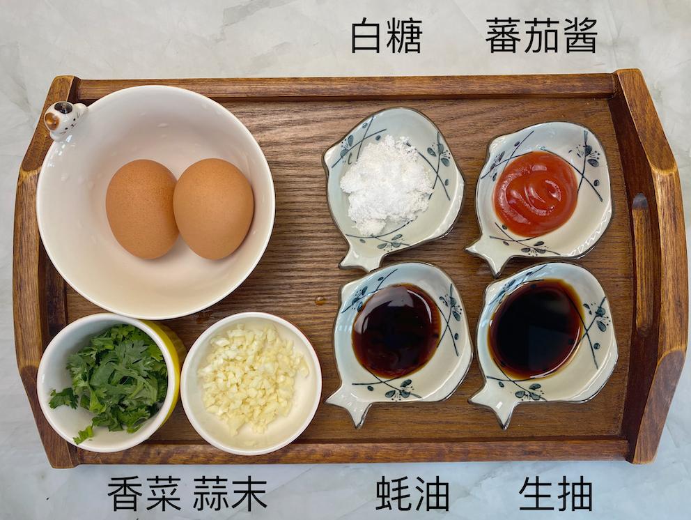 西红柿2斤,鸡蛋2到4个,生抽3小勺,蚝油3小勺,白糖2小勺,蕃茄酱2小勺,蒜末和香菜适量。