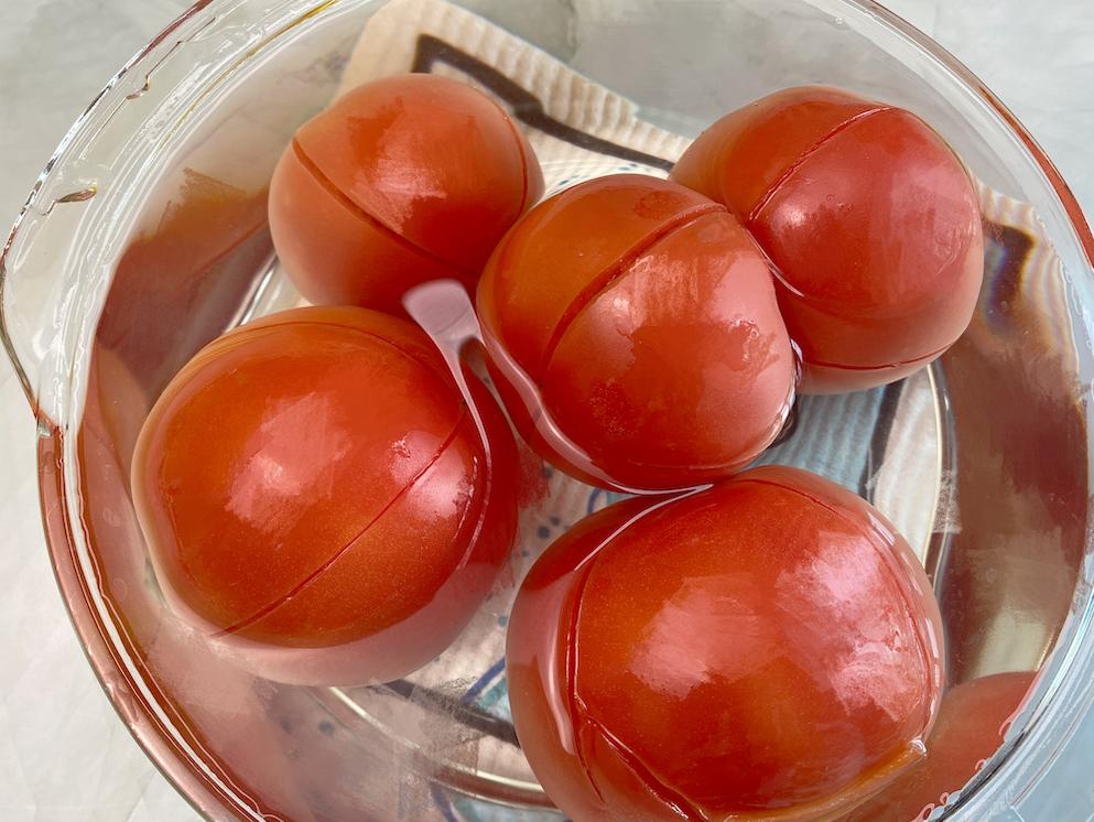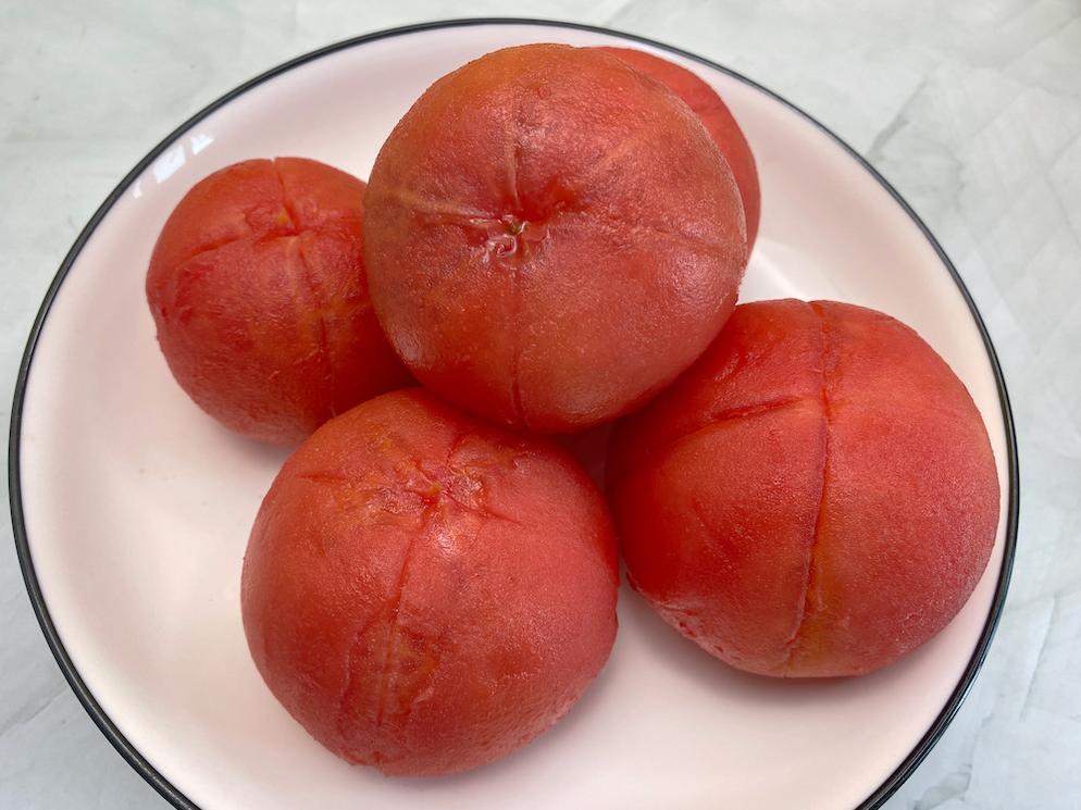 ③ 西红柿划开外皮,用热水泡10分钟,把西红柿皮剥掉,切碎。