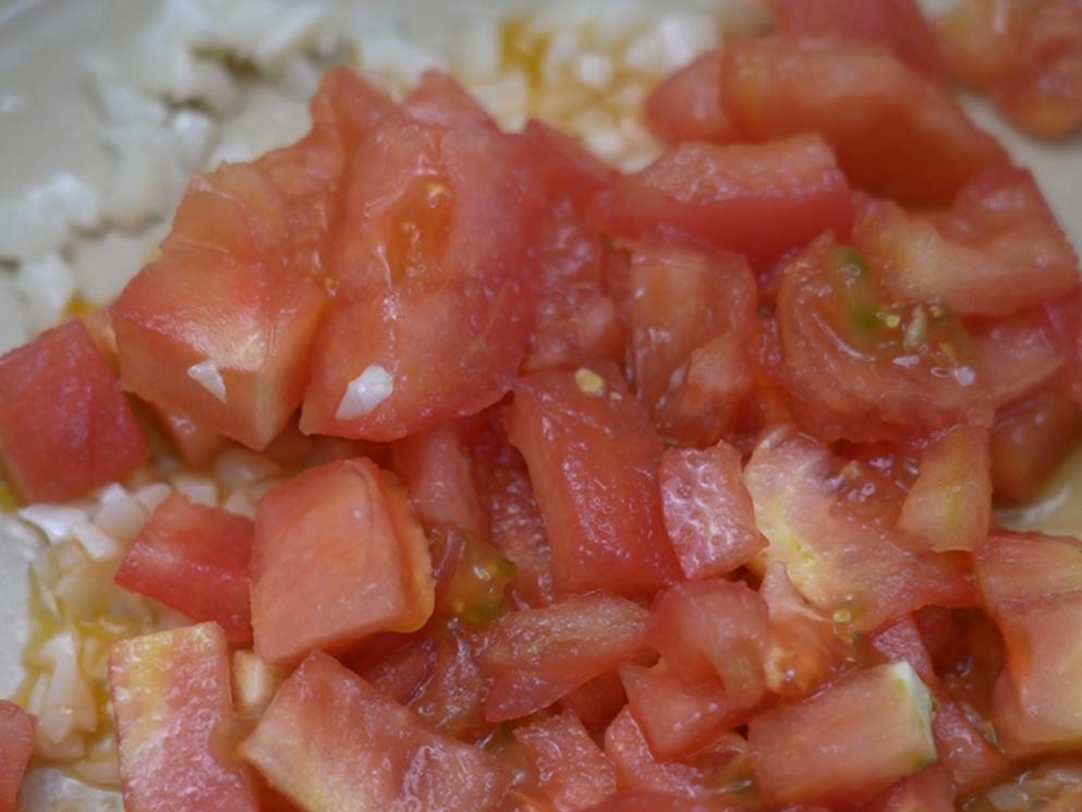 ④ 另起锅倒油,先把大蒜末炒香,再加入西红柿炒软。