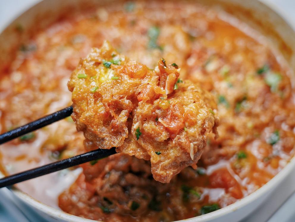 最近,继炸蛋螺蛳粉火了之后,炸蛋西红柿又火了。酥脆的炸蛋饼,放进浓郁的西红柿汤汁里,太下饭了!