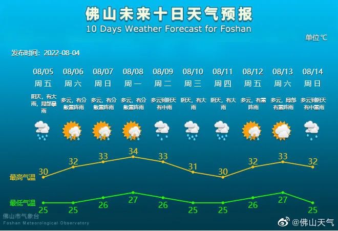 佛山市气象台预计,今日下午到明日受热带低压影响,佛山有暴雨、局部大暴雨,平均风力3级左右,局地伴有雷电和8级左右短时大风。6日降雨明显减弱,有雷阵雨;7-8日多云,有分散雷阵雨,日间气温明显回升,最高气温可达35℃。具体预报如下: