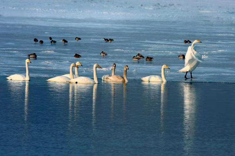 水库湖面结冰的季节,这里变成了候鸟的天堂。每到隆冬季节,迁徙的候鸟来到金川峡觅食生存。山峦间,在树丛的映衬下,在蔚蓝色水面上,它们嬉戏,歌唱,含颈低语,翩跹起舞。