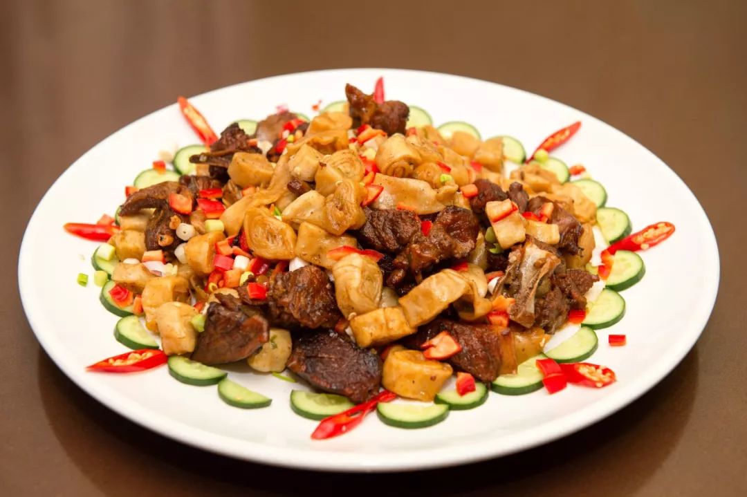 牛肉炒面片也是一绝,面片的麻和辣很出彩,酱汁浓郁,再剥上一头蒜,那滋味更美。面片指甲盖大小,别看小却非常筋道,吃着有嚼劲,大家可以品尝一下。