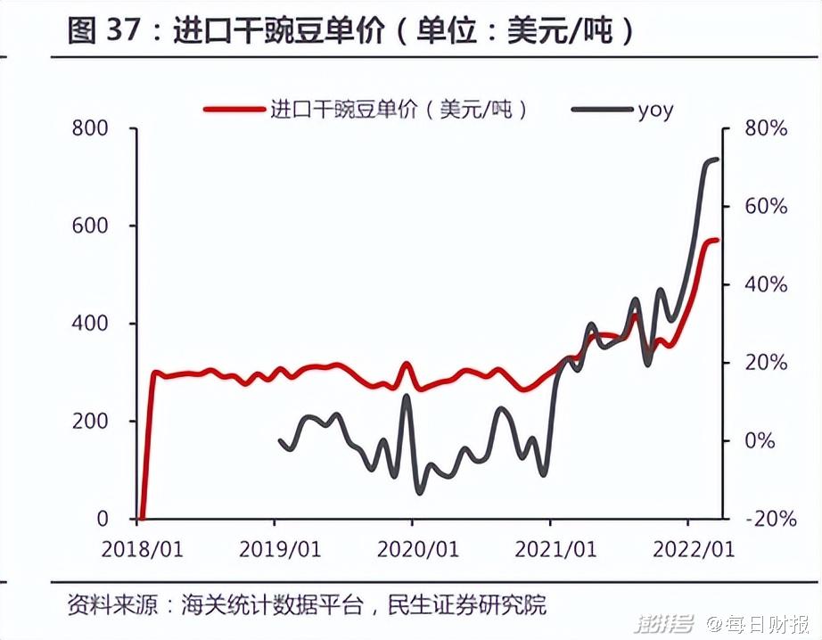 以豌豆为代表的原材料是双塔食品成本的主要来源,占总成本比例64.94%。而豌豆价格与国际粮价挂钩,原材料依赖进口。据民生证券研报显示,自2021年以来,进口干豌豆价格就持续上涨,至2022年1月份上涨幅度达到70%左右。