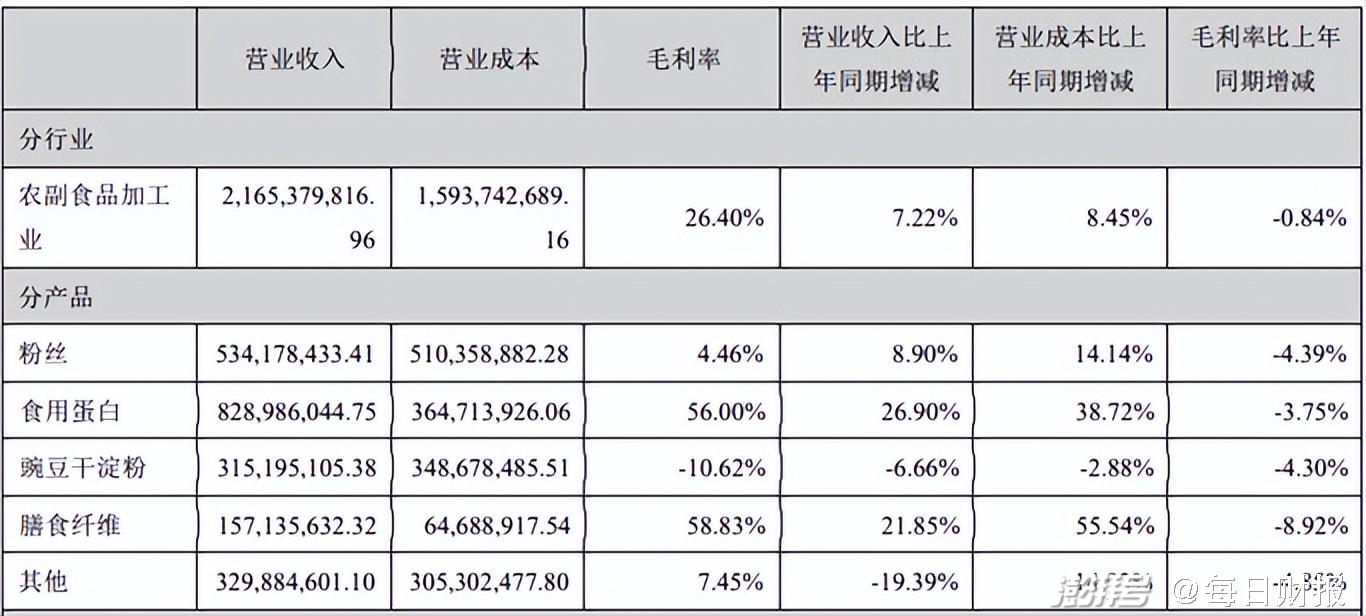 原材料成本大幅上涨,导致2021年双塔食品旗下产品毛利率全面下滑。其中食用蛋白和膳食纤维毛利率较去年同期分别减少3.75%、8.92%;粉丝毛利率本身不高,也较去年同期减少4.39%。
