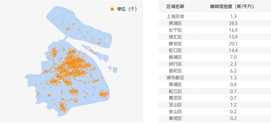 其中,黄浦区成为咖啡馆最热聚集地,每平方公里拥有咖啡馆38.5家。静安和长宁区以每平方公里咖啡馆数量20.1家、16.5家分列二、三位。徐汇区以每平方公里咖啡馆数量15.9家紧跟其后。