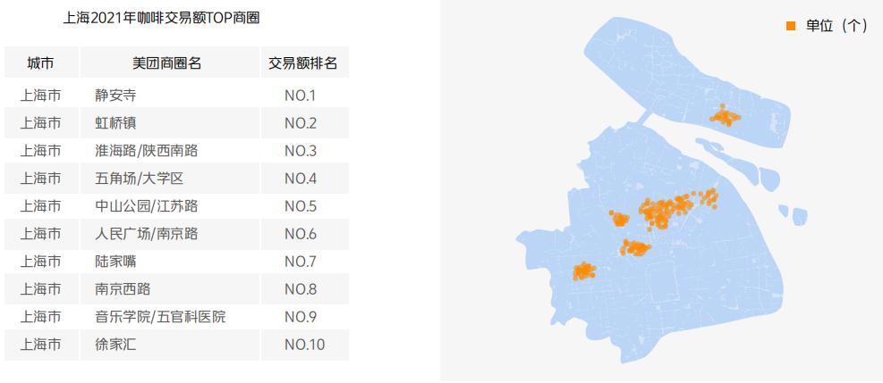 《报告》还显示,2021年上海咖啡厅订单量同比上涨101.70%;从线上订单来看,咖啡订单主要集中在核心商圈。得益于咖啡馆聚集、用户量大,交易额前三商圈是:静安寺、虹桥镇、淮海路/陕西南路。值得一提的是,徐汇区域的音乐学院/五官科医院和徐家汇商圈也位列交易额TOP10商圈榜单中。