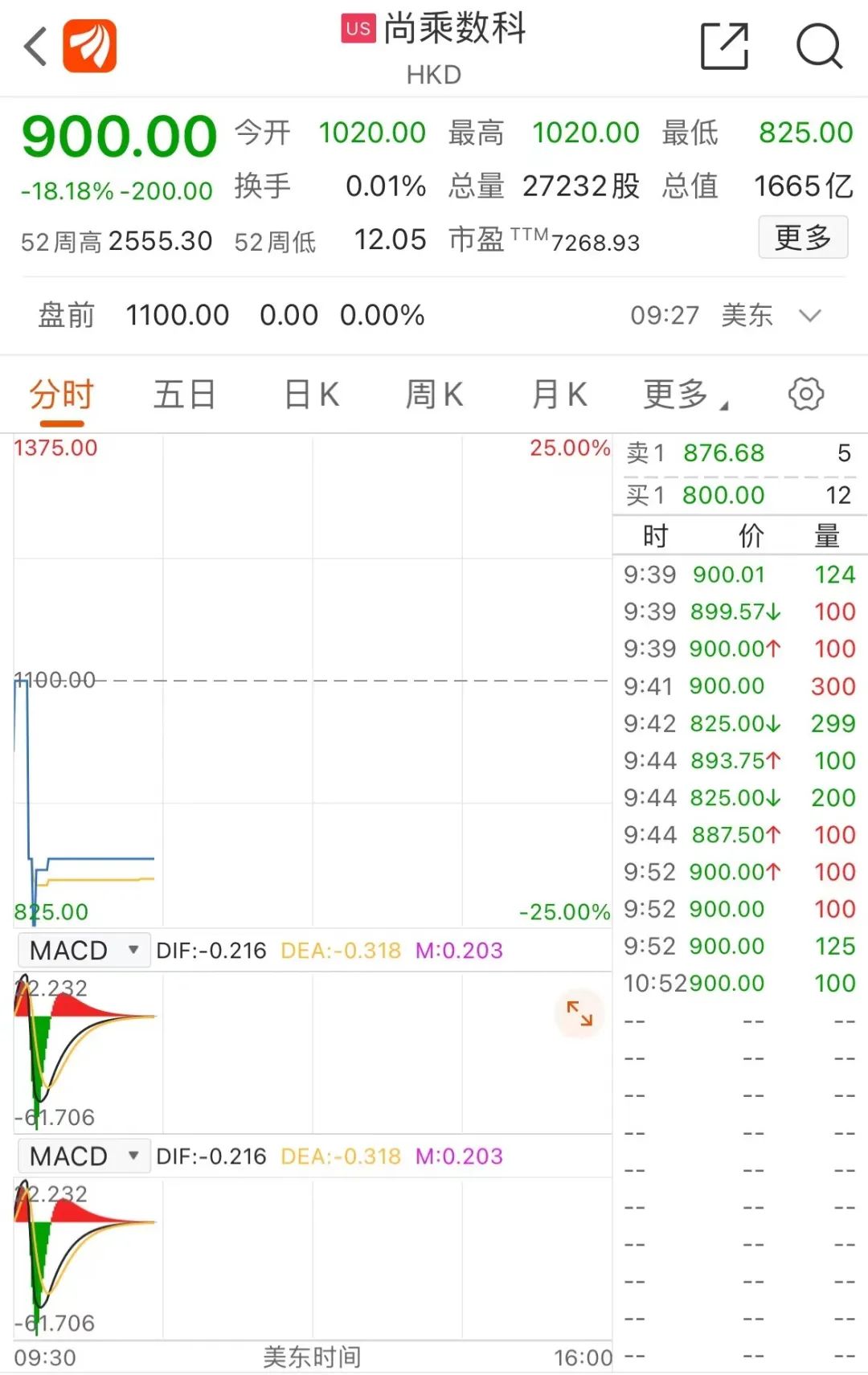 8月4日,尚乘数科美股盘前跌超27%。截至发稿,尚乘数科跌18.18%,报900美元/股。