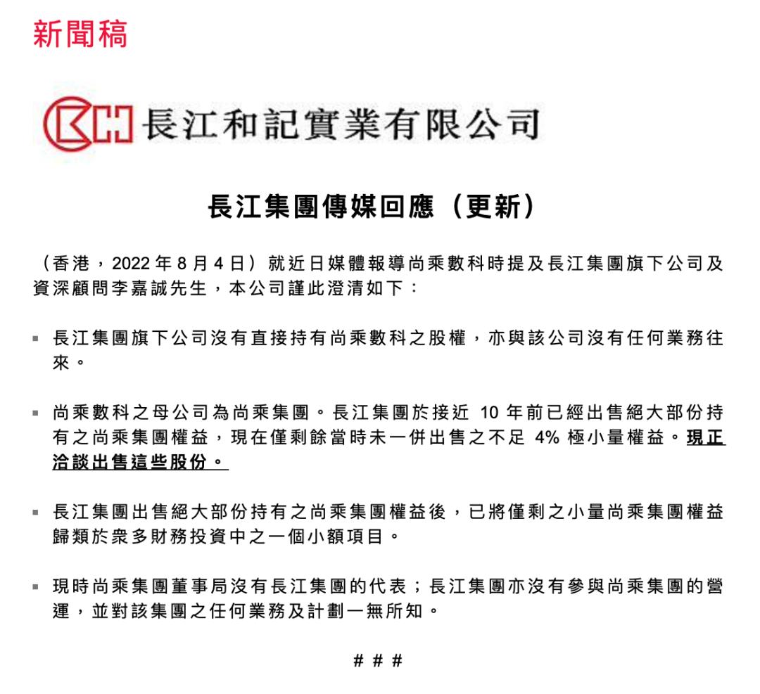 长江集团表示,尚乘数科之母公司为尚乘集团。长江集团于接近10年前已经出售绝大部份持有之尚乘集团权益,现在仅剩余当时未一并出售之不足4%极小量权益。现正在洽谈出售其所持不足4%的尚乘集团股份。