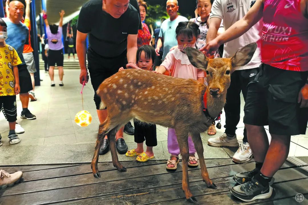每周四晚上,一周岁梅花鹿“六六”在“爸爸”米先生的带领下,也来到西蠡湖夜跑,成为夜跑的明星。