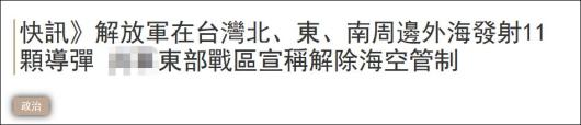台“信传媒”4日下午援引消息人士的话称,“除东北与西南外,亦有导弹飞越台湾本岛,落入东部海域”。报道称,台军方对此强调,“确有解放军试射导弹越过台湾上空一事”。