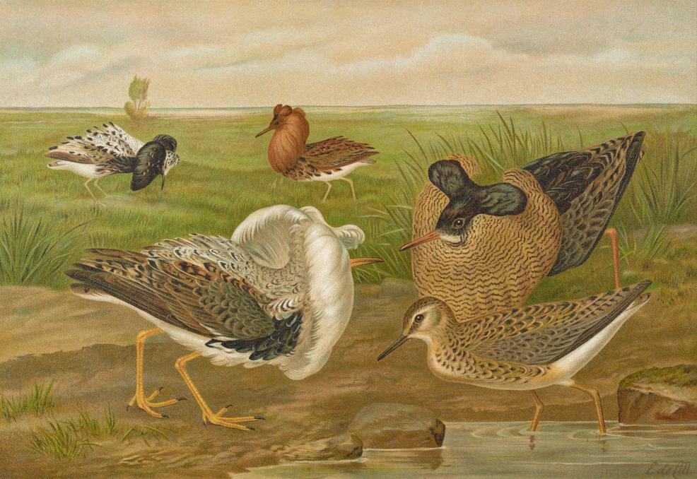 两只雄性黑色流苏鹬狭路相逢,眼下硝烟弥漫,剑拔弩张。雌性缓慢踱着步子,她们更想看看雄性的才艺表演,他们长得赏心悦目,会唱曲会跳舞,能给生活增添更多情趣。两只雄性流苏鹬会意,开始抖擞着胸上的羽毛,张开翅膀笨拙地跳舞。雌性心满意足地走向唱跳俱佳的雄性。然而,没得到青睐的雄性开始耍赖,一脚踹在赢得美人的雄性背上,用尖锐的喙啄对方娇嫩的泄殖腔。后者雄姿英发的样貌不见了,反倒被撵着满场跑。雌性的心上人就这样被暴力逐出了竞技场。