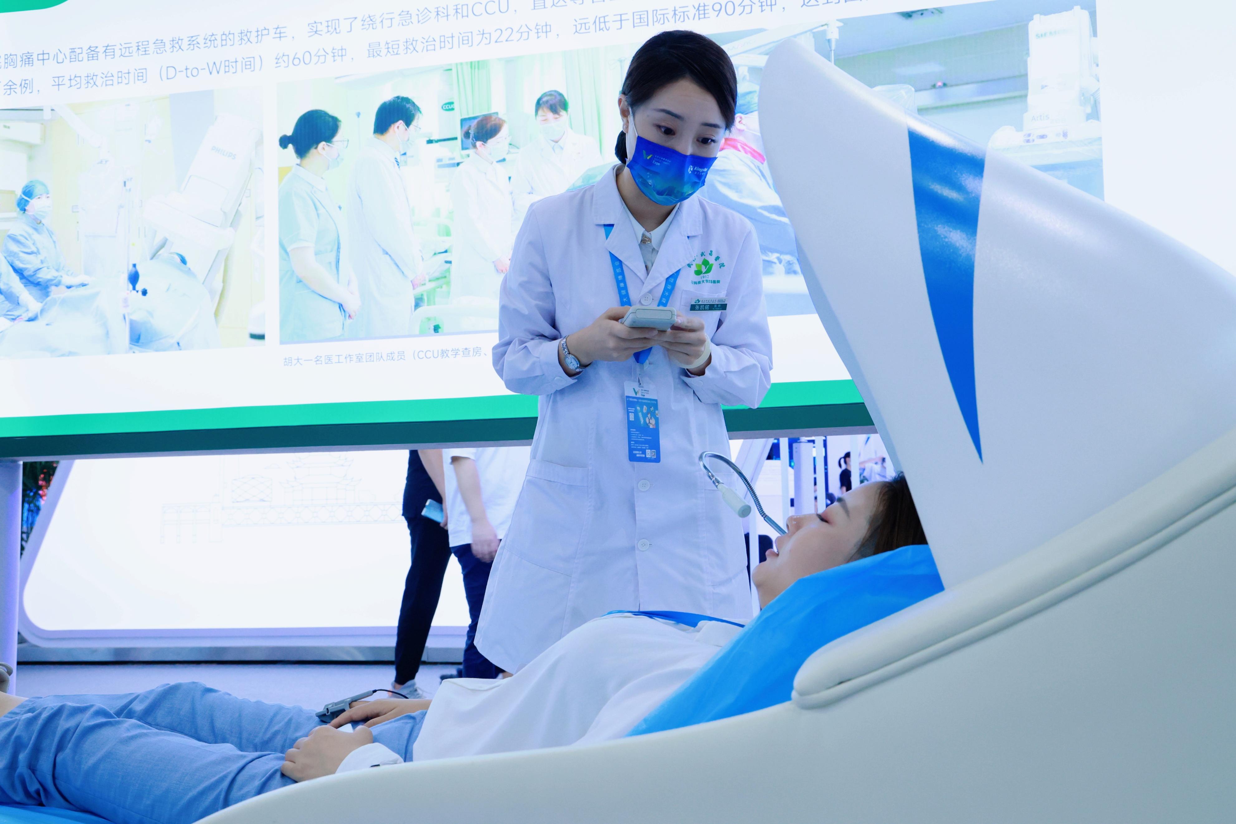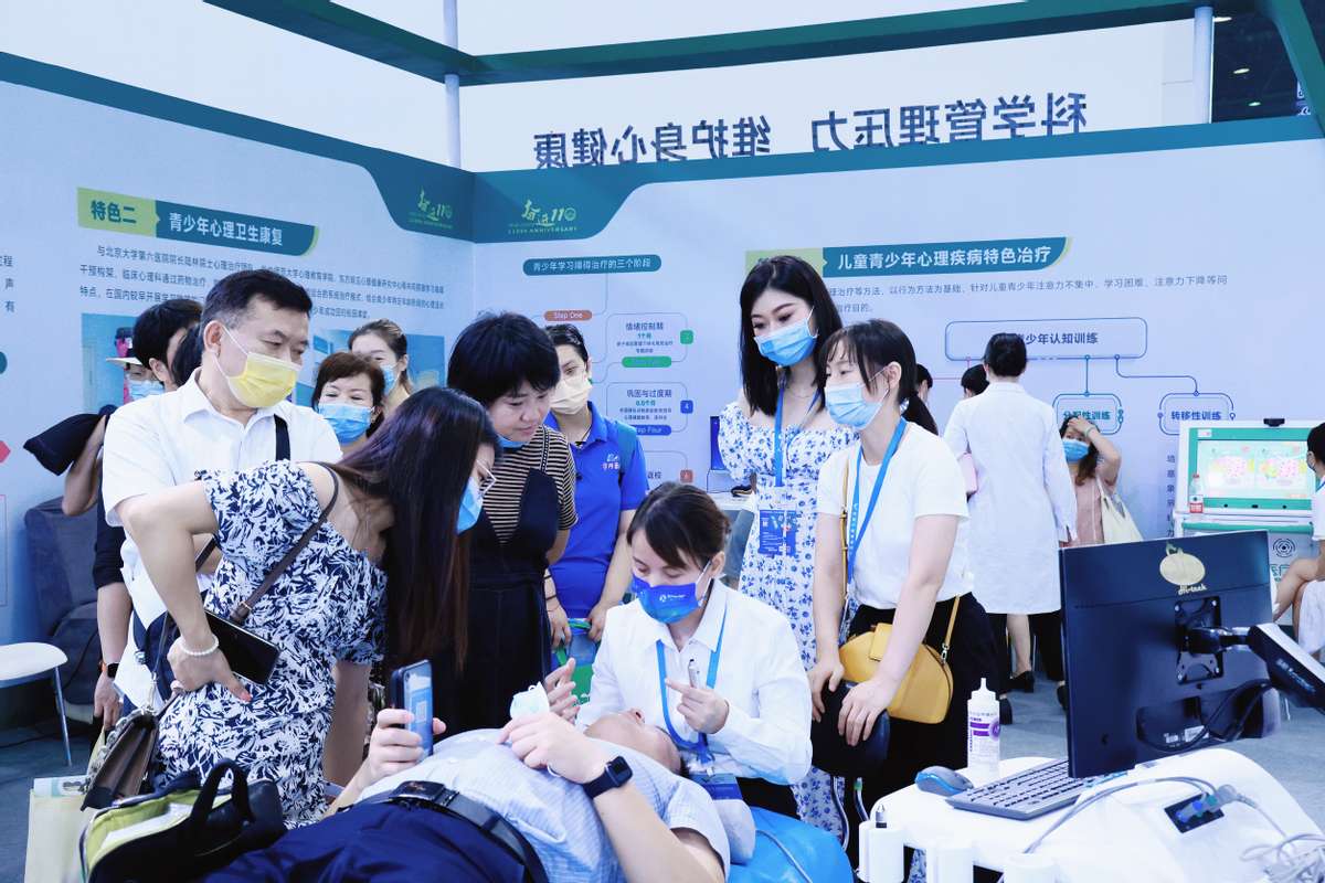 “我特别喜欢‘睡眠舱’,躺在里面不仅有舒缓的音乐,还有像小时候妈妈轻轻拍打背部的感觉,让我特别放松,一下就‘眯’着了。”一位阿姨在体验完智能心理减压舱后愉快的说。“智能心理减压舱里,除了有音乐治疗外,还有大脑氧疗、语音指导、环境模拟,通过呼吸调整、意向放松、催眠放松,让有失眠、焦虑等心理疾病的患者,在‘睡梦中’进行治疗。这也是本次健博会上,‘精神心理诊疗中心’高科技设备之一。”临床心理科医师张凯铭介绍。在青少年心理卫生健康康复区域,儿童注意力测试仪引起了家长的广泛关注,“针对儿童多动症、注意力不集中、学习困难等问题,通过有效的训练,来改善儿童多动现象。”临床心理科护士长汪俊解释。