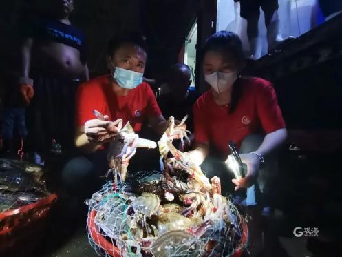 “按筐批发梭子蟹和在市场上挑选不同,透过海鲜筐的大孔,便可以观察到最下层蟹子的大小,再打开网绳,只需晃动几下,无需一一查看,凭借经验就能基本判断出这一整筐蟹子的肥瘦和鲜度了……”和梭子蟹打了10多年交道的张宽方边忙活边提高了嗓门说道,挑选蟹子需要眼疾手快,锁定目标,一看二晃三观察。