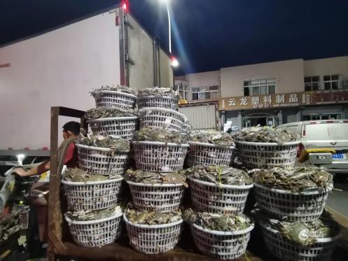 批发市场内设有专门的梭子蟹交易区,几十辆来自江苏连云港、浙江舟山等地牌照的海鲜冷链车排成长队,陆续进入市场。