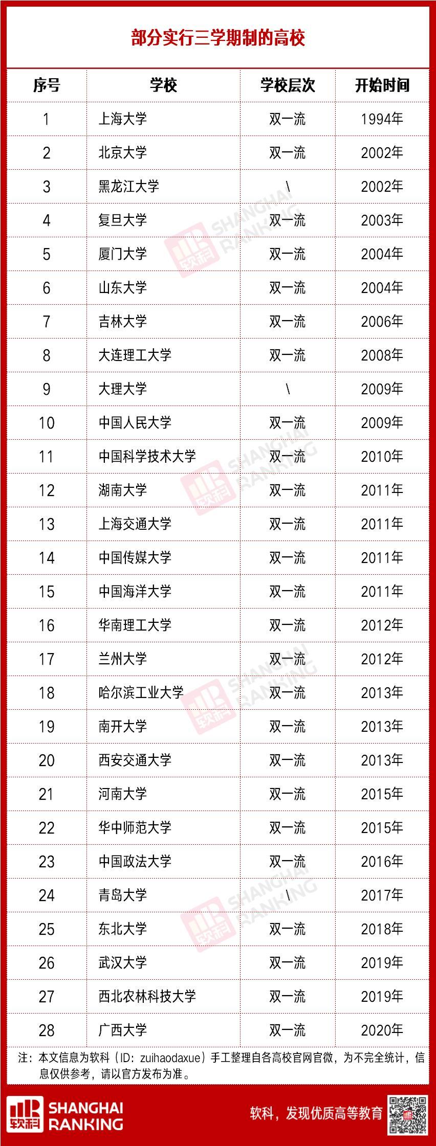 2018年6月,武汉大学正式宣布将于2019年正式实施 “三学期制”。其招生政策介绍,实行三学期制首先给学生带来的变化是开拓其国际视野,增加学生国际交流机会。其次,让学生拥有更为丰富的教学资源,特别是课程资源,学生可以自主安排整个大学期间的学习计划。同时,学校可以更好地集中时间安排创新创业教育,让学生进行实习实训和创新创业实践。