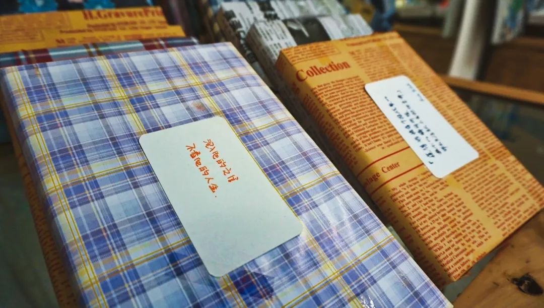 这里摆放的书籍,全都包上了书皮,像是小学时候同学们都爱用的那种纸,但包得更全,严丝合缝,看不到一点关于书的信息。唯独面上贴着一张小卡片,写着一些话,倒像是一份礼物。
