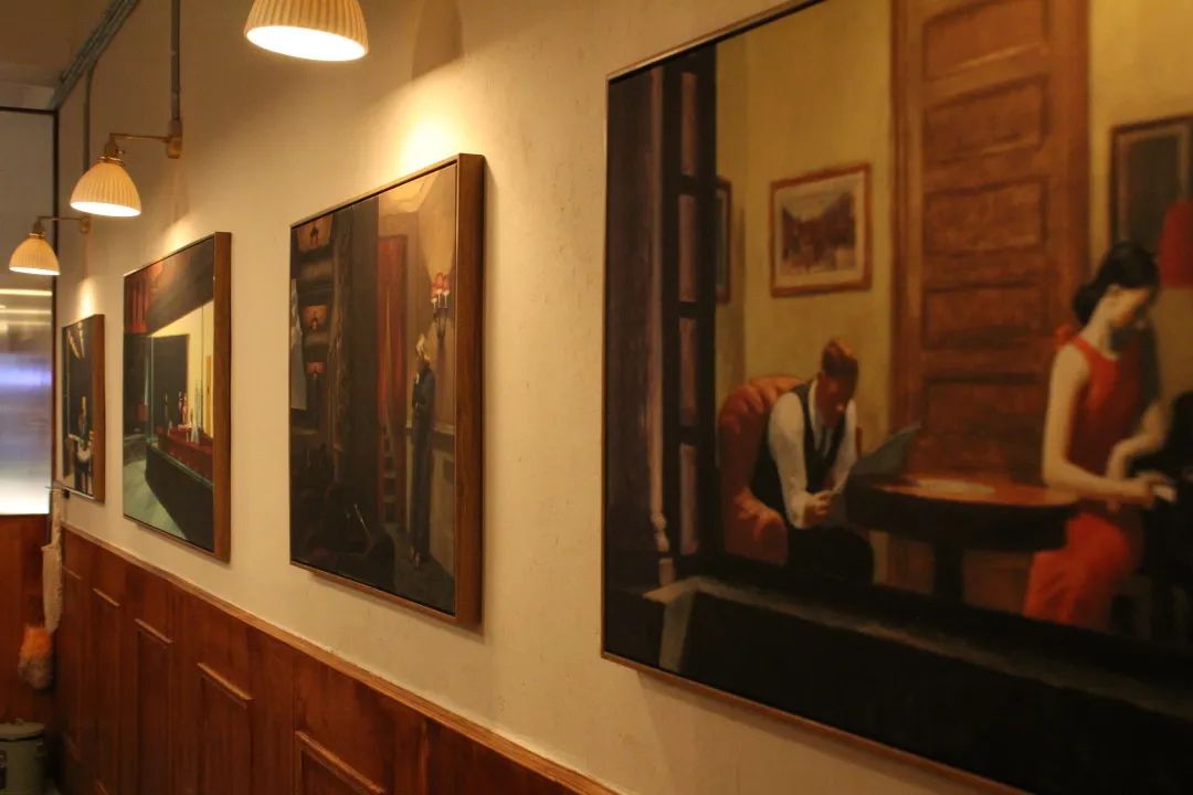 他爱看电影、展览、书,店里的墙上挂着爱德华·霍普的画,《低俗小说》等经典电影的元素也不在少数。我们常常聊展览,却未曾想,来店里和他讨论书的人,更多。
