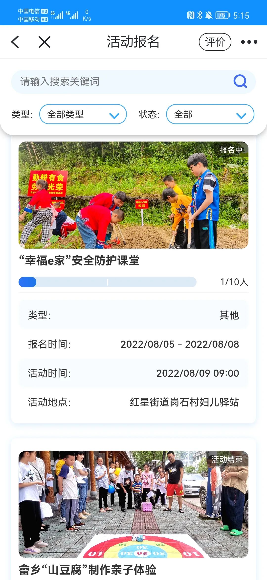 7月28日上午,景宁首个“幸福e家”家庭教育平台线上报名亲子活动举办。红星街道外舍社区妇女儿童驿站在家庭教育线上平台发布畲乡传统美食“山豆腐”亲子活动通知,吸引了社区十几个家庭报名参与。8月5日,岗石村妇女儿童驿站在家庭教育平台上发起了“幸福e家”安全防护课堂活动报名。“幸福e家”家庭教育线上平台推出,让社区家长们既可以在“指尖”学习家教知识,获享省内优质家教资源,又足不出户知晓社区亲子活动,点点参加报名,方便快捷。