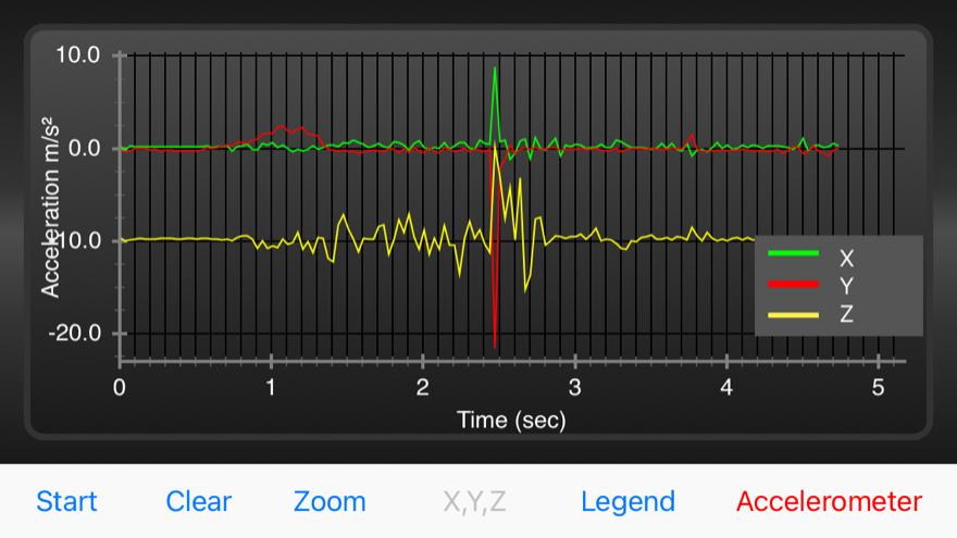 换个方式,我们在手机上下载安装一个加速度计的软件,把手机放在一个玩具小车上向前推动,软件上就记录了小车所经历的不同运动阶段的加速度。