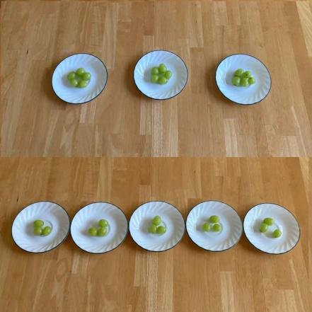比如马博士文章中谈到,由于不区分被乘数与乘数,因此 5x3 = 3x5。这样就必须解释清楚 5+5+5 = 3+3+3+3+3,因而加重了认知负担。在这个例子中,如果我们只拘泥于3个5或者5个3这样的单一视角,确实有点难讲。比如像下图这个例子,很难一眼看出两种情况下葡萄的总数一样。