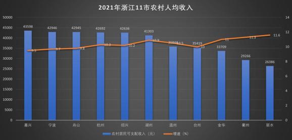 2021年,嘉兴农村居民人均可支配收入为43598元,比浙江省平均水平高出8351元,连续18年卫冕全省首位,2021年城乡居民收入比1.6:1,也是全省地市中最低。