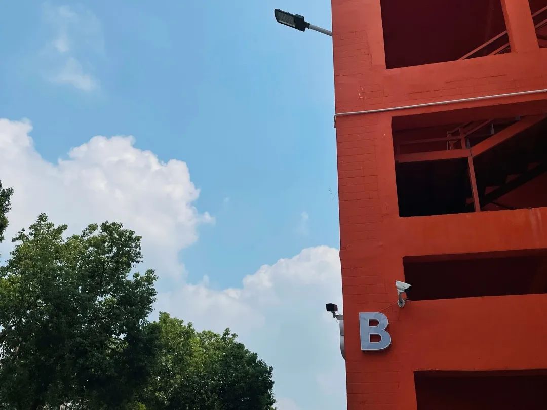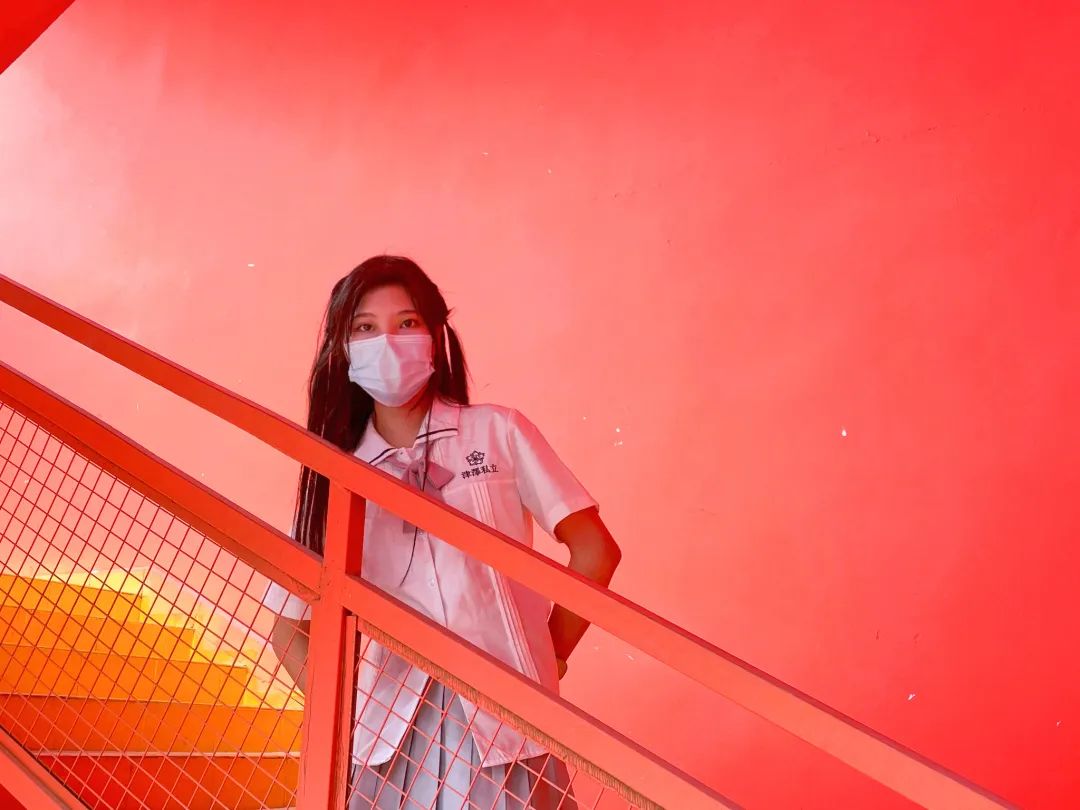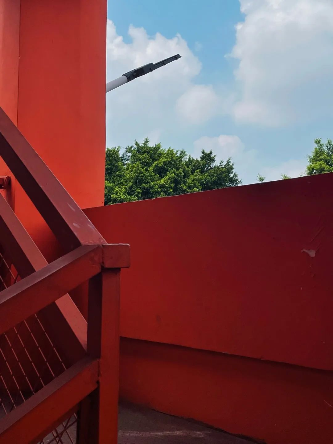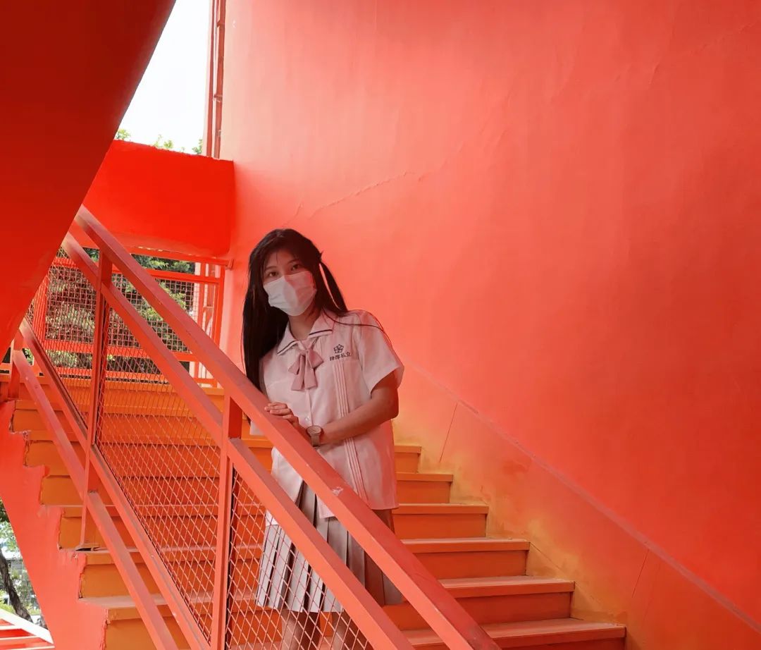 在穿过园区大门口后,映入眼帘的是一条橙黄相间的楼梯。这条色彩感强烈的楼梯在蓝天白云的映衬下,摆好pose随手一拍都是好看的照片。