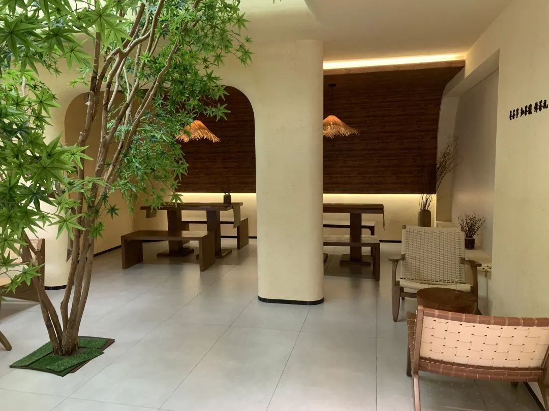 茶馆内放置了树木和各种木质的桌椅,营造出自然、宁静的品茶氛围,让人仿佛置身于深山中。