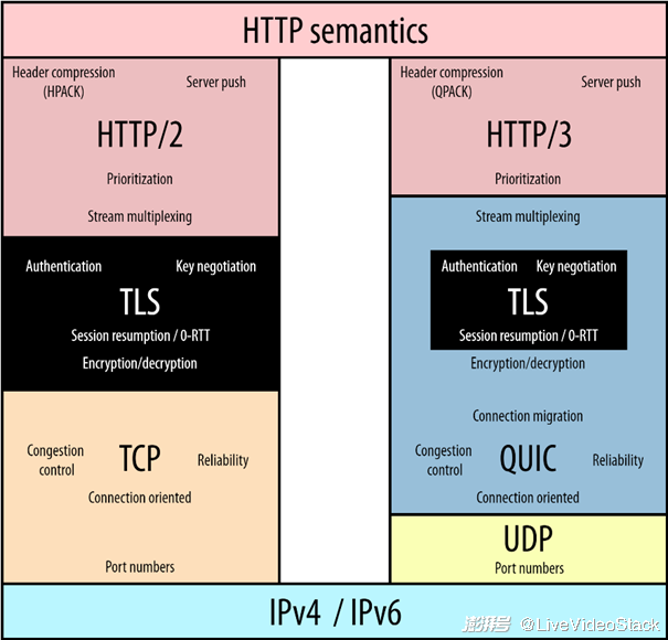 为了与 QUIC 兼容, HTTP/2 在几个关键领域进行了调整。这个调整的版本最终被命名为 HTTP/3(而不是 HTTP/2-over-QUIC),以此命名主要是从市场推广和理解清晰的角度考虑。因此,HTTP/1.1 和 HTTP/2 之间的差异要比 HTTP/2 和 HTTP/3 的差异大很多。