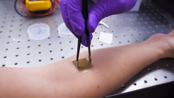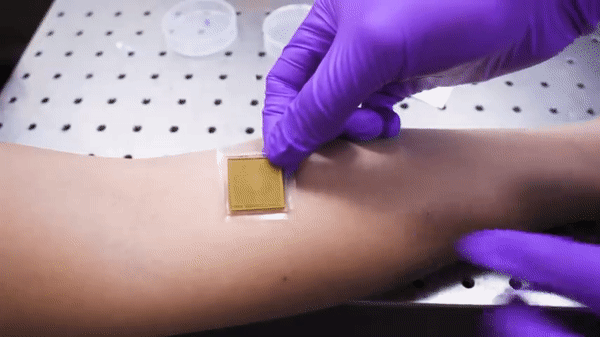 MIT的研究人员开发的这种贴片装置,粘合层由弹性粘合层和刚性传感器阵列的组合组成,其由上下两层薄薄的弹性体组成,固体水凝胶被包裹在其中;下层弹性体被设计用来粘附在皮肤上,上层则被设计用来粘附在刚性的传感器阵列上。